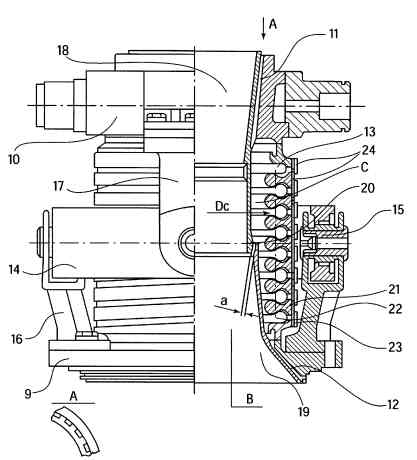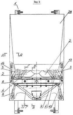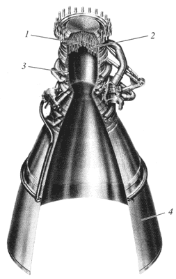 Сильфон 13 выполнен многослойным и снабжен защитными кольцами 21, вставленными между гофрами 22 сильфона 13. Снаружи защитных колец 21 установлен плотно прилегающий к ним кожух 23, выполненный из слоев цилиндрических спиралей 24, соединенных концами с опорными кольцами 9 и 10 сильфонного узла. Смежные слои спиралей прилегают друг к другу, а их витки навиты в противоположных направлениях. Установка металлического силового кожуха в виде металлической цилиндрической спирали снаружи защитных колец 21 сильфона 13 повышает его прочностные свойства и в то же время ограничивает самопроизвольный изгиб сильфона 13 при повороте камеры двигателя на сравнительно большие углы (10-12°), тем самым повышая его устойчивость. Турбонасосный агрегат выполнен по одновальной схеме и состоит из осевой одноступенчатой реактивной турбины, одноступенчатого шнекоцентробежного насоса окислителя и двухступенчатого шнекоцентробежного насоса горючего (вторая ступень используется для подачи части горючего в газогенераторы).