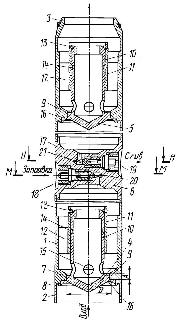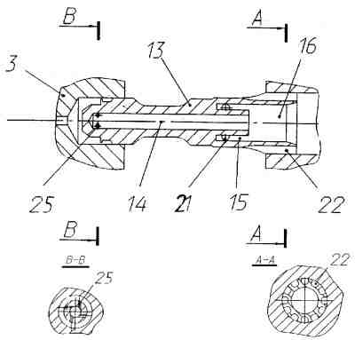 В конструкцию введено средство для заправки корпуса пусковым горючим 6, которое установлено в перегородке 17 корпуса 1 и состоит из двух заглушек - заправочной заглушки 18 и сливной заглушки 19, которые установлены соответственно в заправочном 20 и сливном 21 каналах. Каждая из заглушек имеет резьбовую пробку 22, герметизирующую пробку 23, уплотнительную прокладку 24 и гайку 25. Резьбовая пробка 22 имеет расходное отверстие 26. Заправка ампулы пусковым горючим осуществляется следующим образом. На собранной ампуле до установки гаек 25 и герметизирующих пробок 23 не до конца ввертывают резьбовые пробки 22, таким образом, чтобы обеспечивалось открытие проходного сечения заправочного 20 и сливного 21 каналов через отверстие 26. Производят заправку пусковым топливом, подавая его через заправочный канал 20 во внутреннюю полость корпуса 1 между мембранными узлами 4 и 5, а затем через сливной канал на слив. После окончания заправки ампулы ввертывают до упора резьбовые пробки 22, после чего сливают пусковое горючее перед резьбовой пробкой 22 заправочной заглушки 18 и после резьбовой пробки 22 сливной заглушки 19. После этого устанавливают герметизирующие пробки 23, уплотнительные прокладки 24 и гайки 25. После этого ампула готова к установке на ракетный двигатель. Во внутренней полости ампулы в корпусе 1 между мембранами 8 образуется газовая подушка в результате сборки и заправки ампулы. Наличие газовой подушки способствует обеспечению надежности ампулы при хранении и эффективному движению с ускорением поршня 8 при подаче давления среды на вход ампулы. Устройство работает следующим образом. При воздействии компонента высокого давления со стороны входа на мембранный узел 4 происходит деформация мембраны 8, а потом и разрушение по окружности D. При неравномерном разрушении мембраны 8, с появлением негерметичности, давление перед поршнем 7 не падает, благодаря работе дросселирующей щели, образованной направляющей корпуса 9 и поршнем 7, поршень 7 продолжает двигаться, а после полного разрушения мембраны 8 он разгоняется. Движение поршня 7 с ускорением обеспечивается в связи с наличием усилия от перепада давлений, действующих на площадь поверхности, определяемую диаметром D. Длина "А", на которой поршень двигается с ускорением и зазор между поршнем 7 и направляющей 9 выбраны такими, чтобы обеспечить гарантированное срезание мембраны 8 по всему периметру, требуемую задержку раскрытия проходного сечения магистрали после среза мембраны 8, разгон поршня 7, необходимый для срабатывания пружинного фиксатора 13. Размеры перемычек мембран 8 определяется исхода из заданного давления, обеспечивающего разрушение перемычки. Далее, перемещающийся хвостовик 10 вдоль по потоку фиксируется с помощью пружинного фиксатора 13, при этом гидравлические характеристики открытого мембранного узла 4 воспроизводятся с высокой точностью, так как в потоке компонента отсутствуют элементы конструкции с неопределенным положением. После открытия мембранного узла 4 за счет возросшего давления пускового горючего аналогичным образом открывается мембранный узел 5. Пусковой бачок предназначен для создания давления, требуемого для прорыва мембран ампул с пусковым горючим.
