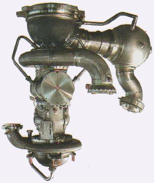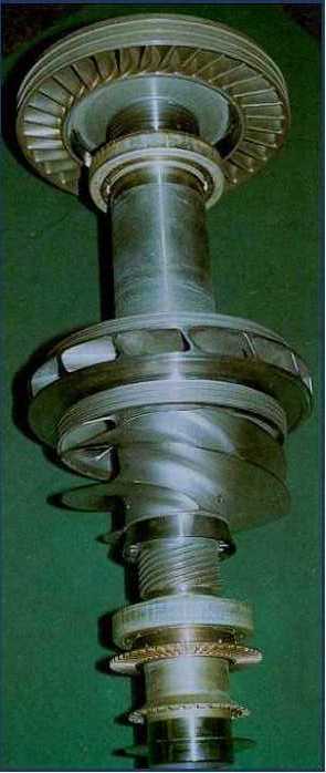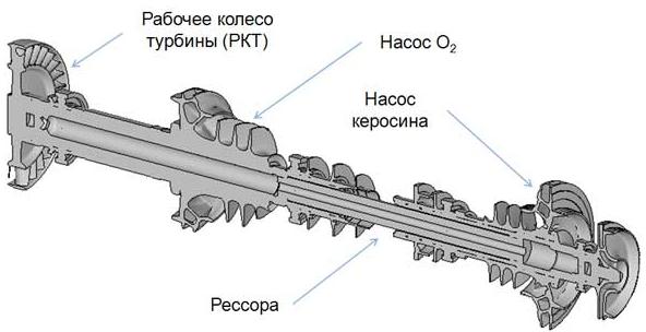 На основном валу с турбиной находится насос окислителя, соосно с которым на другом валу расположены две ступени насоса горючего. Валы насосов окислителя и горючего соединены зубчатой рессорой для разгрузки вала от температурных деформаций, возникающих вследствии большой разницы температур рабрчих тел насосов, а также для предотвращения замерзания горючго. Для защиты радиально-упорных подшипников валов от чрезмерных нагрузок применены эффективные авторазгрузочные устройства. Турбина - осевая одноступенчатая реактивная. Для предотвращения возгорания из-за поломок элементов конструкции или трения вращающихся деталей о неподвижные (вследствие выборки зазоров от деформаций или наклепа на сопрягаемых поверхностях от вибрации) зазор между лопатками соплового аппарата и ротора сделан относительно большим, а кромок лопаток - относительно толстыми. Чтобы исключить возгорание и разрушение деталей газового тракта турбины, в конструкции применены никелевые сплавы, включая жаропрочные для горячих газовых магистралей. Статор и выхлопной тракт турбины принудительно охлаждаются холодным кислородом. В местах малых радиальных или торцевых зазоров используются разного рода теплозащитные покрытия (никелевые для лопаток ротора и статора, металлокерамического для ротора), а также серебряные или бронзовые элементы, исключающие возгорание даже при возможном касании вращающихся и неподвижных деталей турбонасосного агрегата. Для уменьшения размеров и массы посторонних частиц, могущих привести к возгоранию в газовом тракте турбины, на входе в двигатель установлен фильтр с ячейкой 0.16х0.16 мм. Высокое давление жидкого кислорода и, как следствие, повышенная орпсность возгорания обусловили конструктивные особенности насоса окислителя. Так, вместо плавающих уплотнительных колец на буртах крыльчатки (обычно используемых на менее мощных ТНА) применены неподвижные щелевые уплотнения с серебряной накладкой, поскольку процесс "всплывания" колец сопровождается трением в местах контакта крыльчатки с корпусом и может привести к возгоранию насоса. Шнек, крыльчатка и торовый отвод нуждаются в особенно тщательном профилировании, а ротор в целом - в особых мерах по обеспечению динамической сбалансированности в процессе работы. В противонм случае вследствие больших пульсаций и вибраций происходят разрушения трубопроводов, возгорания в стыках вследствие взаимного перемещения деталей, трения и наклепа. Для предотвращения возгорания из-за поломок элементов конструкции (шнека, крыльчатки и лопаток направляющего аппарата) в условиях динамического нагружения с последующим возгоранием из-за затирания обломков использованы такие средства, как повышение конструктивного совершенства и прочности за счет геометрии, материалов и чистоты отработки, а также введение новых технологий: изостатическое прессирования литых заготовок, применение гранульной технологии и другие виды.