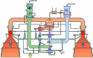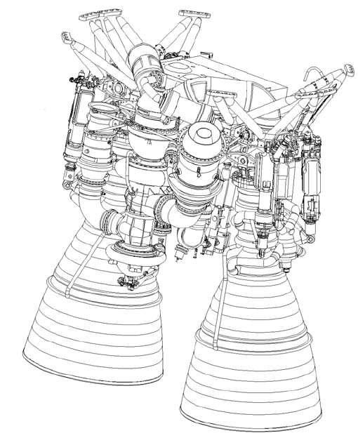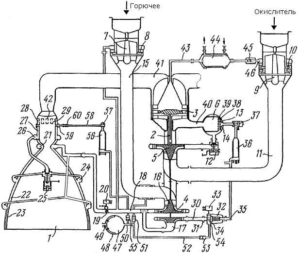 Двигатель содержит содержит две камеры сгорания 1, турбонасосный агрегат 2, состоящий из турбины 3, двухступенчатого насоса горючего 4 и одноступенчатого насоса окислителя 5, газогенератор 6, бустерный насос горючего 7, приводом которого является гидравлическая турбина 8, и бустерный насос окислителя 9, приводом которого является газовая турбина 10. Бустерный насос окислителя (БНАО) 9 через трубопровод 11 соединен со входом насоса окислителя 5, выход которого через пускоотсечной клапан 12 соединен с коллекторной полостью 13 смесительной головки 14 газогенератора 6. На входе БНАО установлен фильтр окислителя. Бустерный насос горючего (БНАГ) 7 через трубопровод 15 соединен со входом первой ступени 16 насоса горючего 4. Первая ступень насоса горючего 16 соединена со входом второй ступени 17 насоса горючего и через трубопровод 18, в котором установлен дроссель 19 с электроприводом 20, соединена с коллектором 21 камеры сгорания 1, из которого горючее распределяется по каналам 22 регенеративного охлаждения камеры сгорания 1. На входе БНАГ установлен фильтр горючего. Каналы 22 регенеративного охлаждения сопла 23 через коллектор 24 соединены с пускоотсечным клапаном 25. Выход этого клапана соединен с коллектором 26, размещенным на цилиндрической части камеры сгорания. Выход коллектора 26 через регенеративные каналы 27 охлаждения цилиндрической части камеры сгорания соединен с полостью горючего 28 смесительной головки 29 камеры сгорания 1. Вторая ступень 17 насоса горючего 4 (через который проходит 20% от общего расхода горючего) через трубопровод 30 соединена с основным входом 31 регулятора тяги 32, управляемого электроприводом 33 и имеющим на входе обратный клапан 34. Выход 35 регулятора тяги 32 соединен с ампулой 36, заполненной пусковым горючим триэтилалюминием Аl(С2Н5)з. Выходы из этих ампул через пускоотсечные клапаны 37 соединены с полостью горючего 38 смесительной головки 39 газогенератора 6. Выход газогенераторов 40 соединен с турбиной 3, выход которой через трубопроводы 41 соединен с полостью 42 смесительных головок 29 камер сгорания 1. Кроме того, выход из турбины 3 через трубопровод 43, в котором установлен теплообменник 44 и клапан давления 45, соединен с коллектором турбины 46 привода бустерного насоса 9 окислителя. Пневмогидравлическая схема ЖРД содержит также систему запуска, которая включает пусковой бачок 47 с разделительной мембраной 48, патрубок 49 подвода газа высокого давления и выходной патрубок 50. Выходной патрубок 50 пускового бачка 47 через заправочный клапан 51 соединен с трубопроводом 15 подвода горючего от бустерного насоса горючего 7. Кроме того, выходной патрубок 50 с одной стороны через трубопровод 52, в котором установлен обратный клапан 53, соединен со вторым входом 54 регулятора тяги 32, через который осуществляется запуск двигателя, а с другой стороны - через обратный клапан 55 - соединен с ампулой 56, заполненной пусковым горючим триэтилалюминием Аl(С2Н5)з, выход которой через клапан 57 соединен с магистралью 58 подвода пускового горючего к форсункам зажигания 59 камеры сгорания. В магистрали 58 установлен жиклер 60, обеспечивающий дозированную подачу пускового горючего к форсункам зажигания. Для уменьшения импульса последействия пускоотсечные клапаны горючего установлены между охлаждающими трактами сопла и камеры сгорания (клапаны 25), а также перед кол