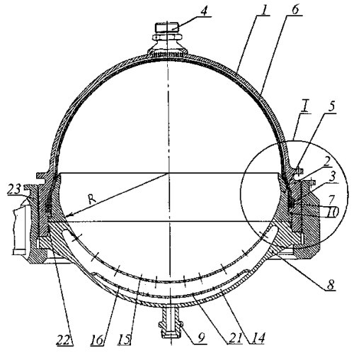 Пусковой бачок содержит силовую оболочку 1, выполненную в форме полусферы, и трубчатый фланец 2, сопряженный на своем торце с торцом силовой оболочки 1. Трубчатый фланец 2 расположен вдоль продольной оси упомянутой полусферы силовой оболочки 1 и на его внутренней поверхности выполнена кольцевая канавка 3. Штуцер 4 для заправки и выдачи жидкости установлен в силовой оболочке 1. Прижимное кольцо 5 расположено соосно продольной оси силовой оболочки 1. Эластичная диафрагма 6 закреплена между трубчатым фланцем 2 и прижимным кольцом 5 и выполнена в форме полусферы, сопряженной с цилиндром, на наружной поверхности в основании которого выполнен концевой выступ 7, размещенный в кольцевой канавке 3 трубчатого фланца 2. Наружная поверхность прижимного кольца 5 и внутренняя поверхность трубчатого фланца 2 в месте размещения концевого выступа 7 в кольцевой канавке 3 выполнены цилиндрическими. Устройство имеет днище 8, выполненное в форме части сферы, с возможностью воздействия его торца на торец прижимного кольца 5 и герметичного соединения с трубчатым фланцем 2 силовой оболочки 1. Штуцер 9 для подвода управляющего газа установлен в днище 8. В конструкцию введено тонкостенное кольцо 10, на котором выполнен бурт 11 и которое установлено между прижимным кольцом 5 и эластичной диафрагмой 6 в месте расположения ее кольцевого выступа 7. Рассекатель 16 выполнен в виде пластины, перфорированной отверстиями 21, края которой прикреплены к внутренней поверхности днища 8 в полости 14, соединенной со штуцером 9 для подвода управляющего газа. Рассекатель 16 с отверстиями 21 служит для равномерного воздействия потока газа на эластичную диафрагму 6. Работает устройство следующим образом (см. также раздел работа ПГС). Через штуцер 4 происходит заполнение бачка основным горючим, при этом происходит перекладка эластичной диафрагмы 6 на днище 8. Затем подается управляющий газ через штуцер 9, под действием которого диафрагма 6 перекладывается в исходное положение, вытесняя основное горючее через штуцер 4. Благодаря принятой конструкции узла крепления концевого участка эластичной диафрагмы при высоком давлении обеспечивается герметичность при многоразовых перекладках (более 450), и обеспечивается возможность перегиба эластичной оболочки практически без ее растяжения.