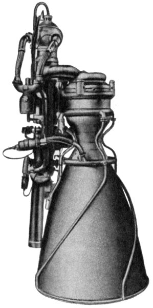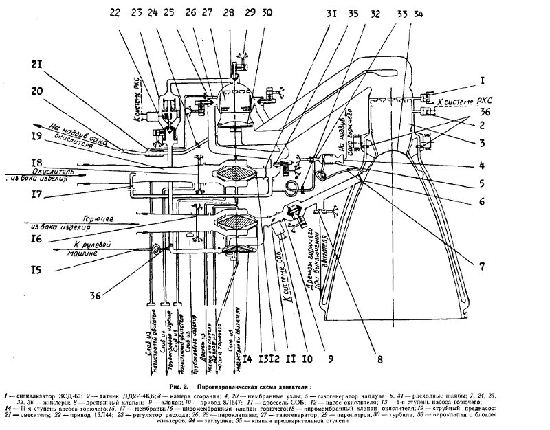 Останов двигателяКоманда на останов двигателей выдается по достижению ракетой заданной скорости через программный токораспределитель. Для уменьшения гидроударов, возникающих в магистралях двигателя при закрытии клапанов, выключение производится в две ступени и за определенное время перед выключением, в случае работы двигателя на режиме форсирования, система РКС обеспечивает перевод работы двигателя на номинальный режим. По первой команде на выключение закрываются пироклапан горючего 28 основного газогенератора и пироклапан 33 окислителя газогенератора наддува, что приводит к прекращению расходов соответствующих компонентов топлива через газогенераторы. По этой же команде происходит выключение систем РКС и СОБ, блокируется сигнализатор давления 1, задействованный в СБН (система безопасности носителя). Вторая команда на выключение двигателя подается через 0,2 ± 0,03 сек. По этой команде закрываются пироклапаны 26 окислителя основного газогенератора, клапан 9 горючего. КС и открывается дренажный клапан 8. При закрытии указанных клапанов прекращается доступ соответствующих компонентов топлива в газогенераторы, камеру сгорания и смеситель. Двигатель прекращает работу. При открытии дренажного клапана 8 горючее из за рубашечного пространства КС выбрасывается в атмосферу для уменьшения импульса последействия. Схема ракеты предусматривает аварийное выключение двигателей при запуске. По решению технического руководителя может быть подана "вручную" команда АВД (аварийное выключение двигателя), если через 2,0±0,1 секунды от команды ГСТ не проходит сигнал КП. Порядок срабатывания агрегатов автоматики при АВД такой же, как и при нормальном выключении двигателей, но при этом открытие дренажного клапана 8 не производится. Кроме того, возможно выключение двигателей при полете ракеты на активном участке от СБН, порядок срабатывания агрегатов такой же, как и при нормальном выключении.