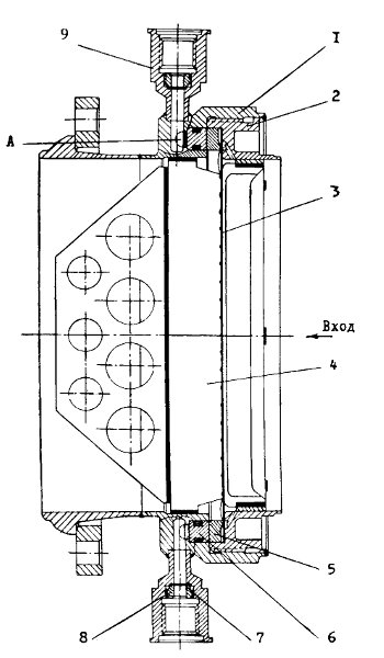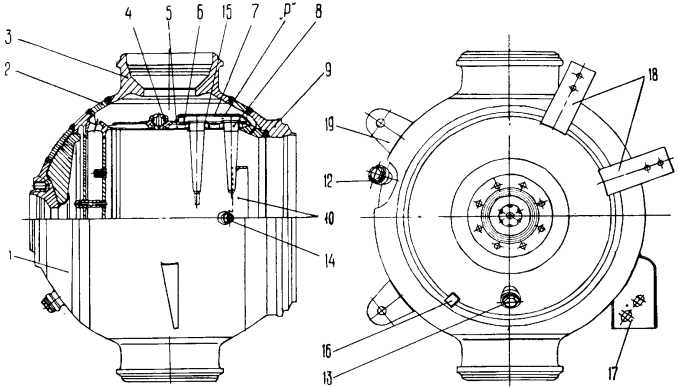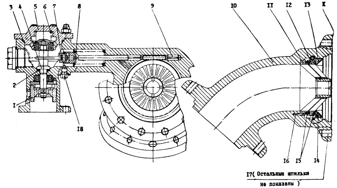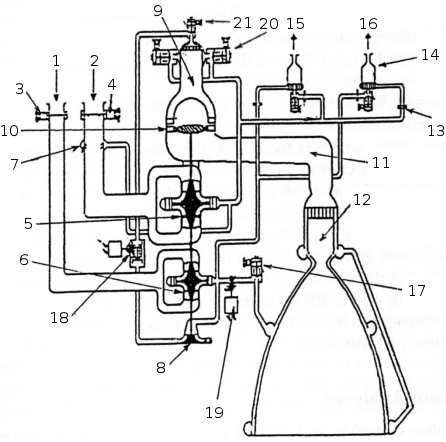 Насос окислителяНасос предназначен для подачи окислителя в газогенераторы и струйный преднасос. Основным рабочим элементом насоса является крыльчатка закрытого типа с двухсторонним входом. Крыльчатка отлита из высокопрочного алюминиевого сплава и для защиты от коррозии фосфатируется. На входе в крыльчатку установлены шнеки 15,изготовленные из нержавеющей стали. Для предотвращения местного нагрева и возгорания материала из-за возможного появления надиров и наклепов посадочные места и торцы шнеков омеднены, а между шнеками и крыльчаткой введены медные кольца. Корпус насоса выполнен в виде отливки из высокопрочного алюминиевого сплава и для защиты от коррозии анодирован. Полости высокого и низкого давления насоса разделяются посредством установки на бурты крыльчаток плавающих лабиринтных уплотнений. Полости турбины и насоса окислителя разделяются гидрозатвором лабиринтного типа 4, также выполняющего роль авторазгрузочного устройства компенсирующего осевое усилие от турбины. Уплотнение по валу со стороны крышки 7 состоит из гидрозатвора, сильфонного и манжетного уплотнений. Для обеспечения компенсации тепловых расширений корпуса насоса и вала внешняя обойма подшипника 9 в корпусе не зафиксирована. Для исключения проворота вала относительно подшипника внутренняя обойма последнего устанавливается на вал с гарантированным натягом.