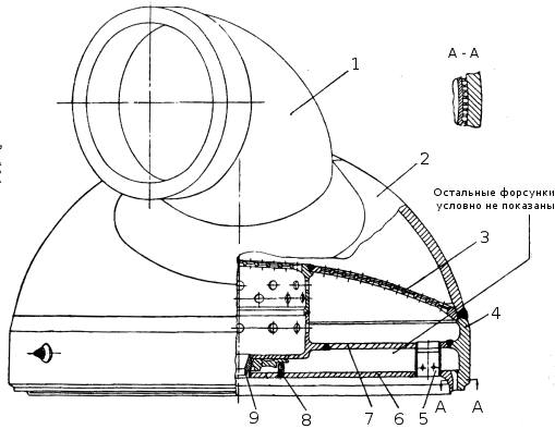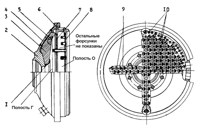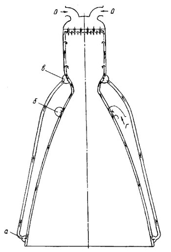 Охлаждение камеры сгорания комбинированное наружное и внутреннее. Наружное охлаждение обеспечивается протоком горючего по межрубашечному пространству камеры, а внутреннее организовано подачей части "Г" через отверстия в стенках поясов завесы на внутреннюю поверхность нижней части КС. Поступающее из коллектора (б) в межрубашечное пространство горючее разветвляется на два потока, один из которых направляется к критическому сечению, другой к срезу сопла. На срезе сопла последний собирается в коллекторе (а) и по перепускным трубопроводам поступает в коллектор (в) бандажа, здесь же оба потока соединяются. Далее, проходя по зарубашечному пространству цилиндра КС, горючее поступает в ФГ и через форсунки впрыскивается в камеру. Разделение "Г" на два потока позволило уменьшить высоту зарубашечной щели на большей части поверхности камеры сгорания, что существенно снизило вес камеры без ущерба для качества охлаждения. Горючее, которое отбирается из зарубашечного пространства подается в поясы завесы, закручивается наклонными каналами и в виде равномерной пелены ложится на огневую поверхность нижней части КС. Пелена прижимается к стенке КС набегающим потоком газов и испаряется под действием высокой температуры. Тем самым снижается соотношение компонентов в пристеночном слое газов, благодаря чему снижается температура стенки.