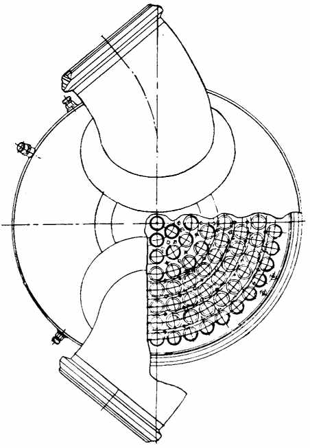 Газогенератор предназначен для создания рабочего тела - газа, необходимого для привода турбины ТНА и наддува бака "О" ракеты через смеситель. Двухзонный газогенератор (рис.12.1) представляет собой неразъемную сварную конструкцию, состоящую из плоской форсуночной головки, пояса разбавления и наружной рубашки. Детали наружной рубашки образуют сферическую поверхность. Соединение деталей и узлов газогенератора осуществлено путем сварки и пайки. Форсуночная головка (рис.12.2) состоит из внутреннего 8, среднего и наружного 4 днищ, приваренных к силовому кольцу 6. Внутреннее и среднее днища образуют полость окислителя, а среднее и наружное полость горючего. Для уменьшения объема полости горючего в ней имеется заполнитель 3, закрепленный кольцом 1 и крючками 5. На форсуночной головке расположено 85 форсунок горючего и 288 форсунок окислителя. Схема расположения форсунок - сотовая. Форсунки горючего припаяны к внутреннему и среднему днищам, форсунки окислителя - к внутреннему днищу. Поле разбавления (рис. 18) состоит из стенки 5, рубашки 6, дефлектора 7 и 32 распылителей 8 , установленных в два ряда в шахматном порядке. В распылителях имеются отверстия, диаметры, количество и схема расположения которых в распылителях выбраны из условия обеспечения равномерности поля температур газа на выходе из газогенератора. Для обеспечения вибропрочности распылителей второго от ФГ ряда к ним приварена цилиндрическая обечайка 10. К днищу 2 приварены две проушины 19 и кронштейн 7 для крепления узлов двигателя. На кронштейн 16 устанавливается вибродатчик, на швеллеры 18 -держатели под датчики давления. Детали наружной рубашки изготовлены из высокопрочной нержавеющей стали, распылители из жаропрочной стали, внутреннее днище - из специальной бронзы с припайкой к нему со стороны окислителя фольги толщиной 0,1 мм из стали Х18Н9. Остальные детали газогенератора изготавливаются из нержавеющей высоколегированной стали. На периферийную часть внутреннего днища (со стороны огневой полости), на внутренние поверхности колец 6, 9 (рис.12.1) и обечайки 10 нанесено жаростойкое циркониевое покрытие с подслоем нихрома для защиты от теплового и эрозионного воздействия горячих газов. На огневую поверхность днища 8 (рис.12.2) наносится покрытие из пористого хрома. Работа газогенератора. Горючее подается через фланец 2 (рис.12.2) на форсуночную головку, откуда через форсунки - во внутреннюю полость газогенератора. Окислитель подводится в ГГ через два фланца 3 (рис.12.1). Около 70% окислителя проходит в форсуночную головку и распыливается форсунками, остальная часть окислителя проходит по каналам, образованным рубашкой 6 и оребренной стенкой 5, охлаждая последнюю. Далее окислитель через отверстия в рубашке 6 поступает в полость Р и через отверстия в распылителях впрыскивается во внутреннюю полость газогенератора против потока газа. Заданное распределение расходов между форсуночной головкой и поясом разбавления обеспечивается подбором проходного сечения между рубашкой 6 и стенкой 5. Указанная схема обеспечивает протекание процесса образования окислительного газа в газогенераторе в двух зонах. Около форсуночной головки происходит смешение и сгорание компонентов топлива с образованием газа повышенной температуры (первая зона). В зоне распылителей продукты сгорания, поступившие из первой 