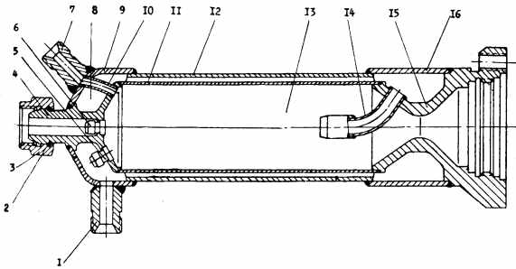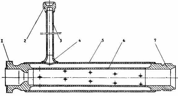 В смесителе образуется газ с избытком окислителя для наддува бака изделия. Смеситель представляет собой сварную конструкцию, состоящую из трубы 6 и кожуха 5. В пяти поперечных сечениях трубы 6 имеется по четыре равнорасположенных по окружности отверстия. К кожуху 5 приварена труба 3, соединяющаяся с полостью окислителя газогенератора. Газ от коллектора турбины через жиклер 1 поступает в трубу 6. Для понижения температуры газа до требуемой из газогенератора через жиклер 2 по трубе 3 подводится окислитель, который через отверстия в трубе 6 впрыскивается в газовый поток. Номинальные расходы газа и окислителя обеспечиваются жиклерами 7 и 2. Таблица 5. Параметры смесителя