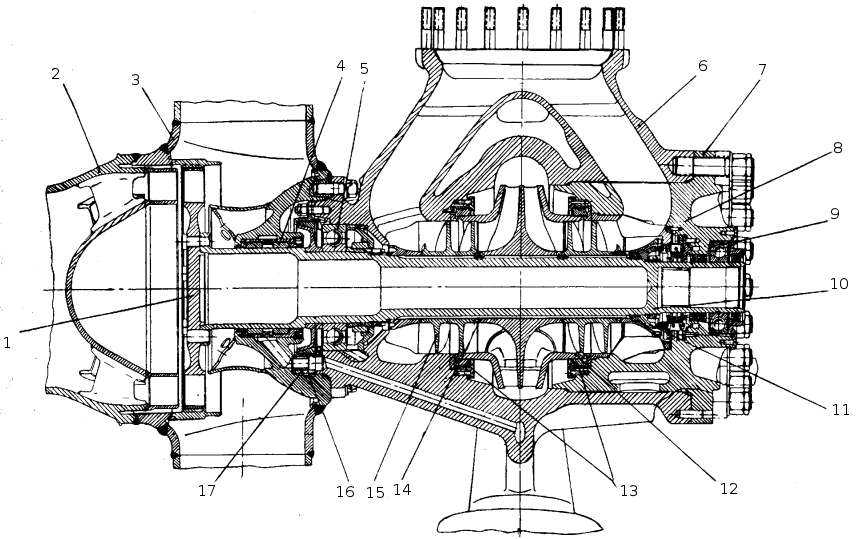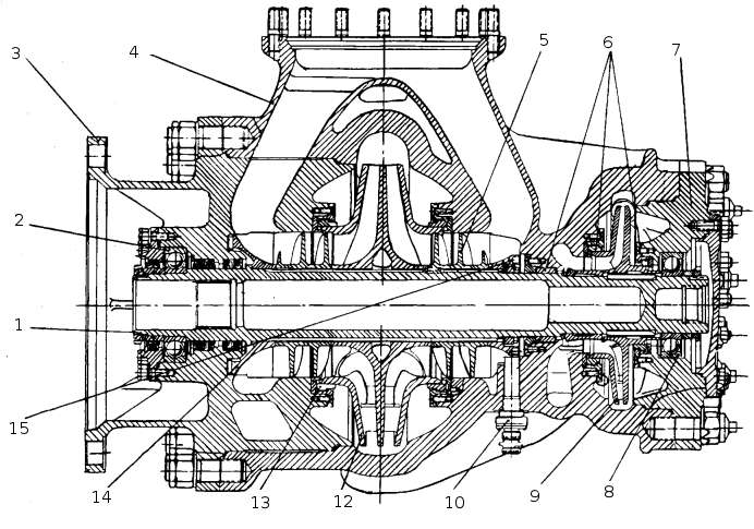 Насос предназначен для подачи горючего в камеру сгорания, газогенераторы и рулевую машинку. Насос горючего центробежного типа, двухступенчатый. Основными рабочими элементами насоса являются крыльчатки первой и второй ступени. Крыльчатка первой ступени насоса горючего закрытого типа с двухсторонним входом отлита из высокопрочною алюминиевого сплава и по конструкции мало отличается от крыльчатки насоса окислителя. Для улучшения всасывающей способности насоса на входах в крыльчатку установлены шнеки 5. Шнеки изготовлены из нержавеющей стали. Крыльчатка второй ступени насоса закрытого типа с односторонним входом и отлита из высокопрочного алюминиевого сплава. Вал насоса 1 изготовлен из конструкционной стали. На валу выфрезерованы прямоугольные шлицы для посадки крыльчатки 11 и шнеков 5 и две шпоночные канавки для посадки крыльчатки 9. Со стороны насоса окислителя вал имеет внутренние эвольвентные шлицы для рессоры. Для замера числа оборотов ТНА на валу 1 установлен магнитопровод 15 с шестнадцатью выступами. В нижней части корпуса первой ступени насоса имеется отверстие для установки датчика 10. Корпус насоса 4, являющийся общим для обеих ступеней, крышки 3 и 7 и крышки уплотнений изготовлены из алюминиевого сплава. В крышках 3 и 7 имеются места для установки подшипников и уплотнений. Подшипник 5 кроме радиальных нагрузок воспринимает осевые усилия, возникающие при работе насоса. Подшипник работает в среде консистентной смазки. Для обеспечения компенсации тепловых расширений корпуса насоса и вала внешняя обойма второго подшипника 1 не зафиксирована относительно корпуса. Подшипник смазывается и охлаждается горючим, поступающим через зазор лабиринтного уплотнения. От подшипника компонент по каналу в корпусе и крышке насоса поступает в полость низкого давления первой ступени насоса. Входные полости первой и второй ступеней насоса, а также полости высокого и низкого давления в каждой ступени, разделены плавающими лабиринтными уплотнениями. Уплотнение насоса со стороны крышки 3 состоит из гидрозатвора и манжетного уплотнения.