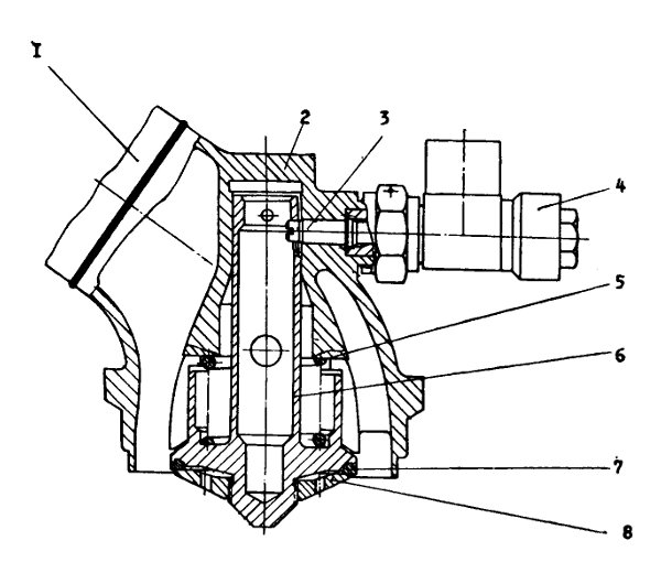 Пироклапан предназначен для прекращения подачи окислителя в газогенератор при выключении изделия. Пироклапан состоит из корпуса 2 и клапана 6. Корпус имеет бобышку с отверстием для установки пирочеки 4. Клапан 6 устанавливается в расточку обтекаемого прилива корпуса 2 и удерживается чекой пирочеки 4. При подаче напряжения на пиропатрон срабатывает пирочека. Чека 3 выходит из зацепления с клапаном 6. Клапан под действием пружины 5 перемещается и садится уплотняющим кольцом 7 на седло газогенератора, прекращая поступление компонента в газогенератор.