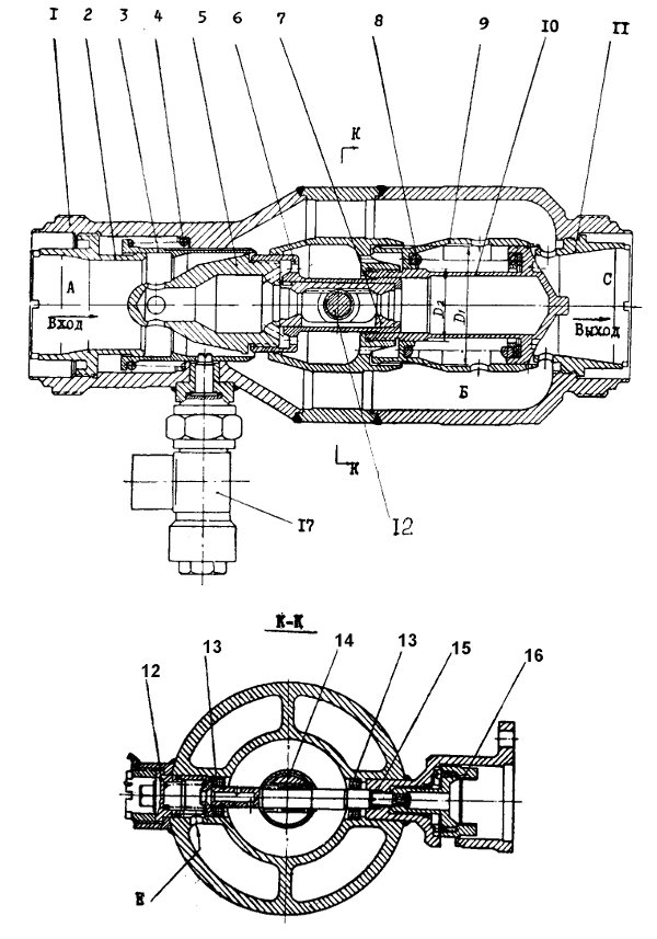 Регулятор расхода является исполнительным органом системы РКС и предназначен для изменения расхода горючего с целью изменения режима работы двигателя, для перевода режима его работы с предварительной ступени на главную и поддержания постоянного расхода, соответствующего режиму работы двигателя на предварительной и главной ступенях. В корпусе 1 со стороны выхода на резьбе установлена направляющая 10 с золотником 9 и пружиной 8. Золотник предназначен для изменения гидравлического сопротивления между полостями Б и С, пружина - для уравновешивания сил от перепада давлений на эффективной площади золотника. Эффективная площадь золотника - кольцевая поверхность, ограниченная диаметрами D1 и D2. Игла 5 предназначена для изменения расхода компонента через регулятор. Перемещается игла при помощи валика 14, который находится в зацеплении с рейкой . Рейка устанавливается в обойме 6 и прижимается торцем иглы 5. Валик 14 установлен на двух шарикоподшипниках 13. На валике крепится полумуфта 16, которая стыкуется с полумуфтой выходного вала привода РКС. Золотник 12 предназначен для точной настройки предварительной ступени регулятора на определенный расход. Поворачивая золотник 12 и меняя при этом площадь окна Е, можно увеличивать или уменьшать перепуск компонента из полости А в полость Б через отверстия в игле 5. На рисунках 26, 27 показан регулятор, настроенный на предварительную ступень. Стакан 3 удерживается в крайнем положении пирочекой 7. При этом величина расхода компонента через регулятор определяется суммарной площадью проходных сечений между стаканом 3 и иглой 5 и окна, обеспечиваемого золотником 12. Для перехода на режим главной ступени подастся напряжение на пиропатрон пирочеки 17. Пиропатрон срабатывает и чека выдергивается из отверстия стакана 3. Стакан усилием пружины 4 отводится до упора о гайку 2, увеличивая проходное сечение между иглой и кромкой стакана. Номинальный расход компонента на режиме главной ступени обеспечивается положением иглы 5 относительно стакана 3. Постоянный расход на режимах предварительной и главной ступеней обеспечивается постоянным перепадом давления между полостями А и Б. При уменьшении расхода через регулятор, вызванного уменьшением давления в полости А или увеличением давления в полости С, равновесие сил, действующих на золотник 9 (сила пружины и сила от перепада давления на эффективную площадь золотника), нарушается. Золотник перемещается в сторону увеличения дросселирующей щели, тем самым уменьшает гидравлическое сопротивление между полостями Б и С. Давление в полости Б падает до величины, при которой наступает равновесие сил, действующих на золотник. Перепад давлений между полостями Л и Б, а, следовательно, и расход восстанавливаются. При поступлении команды от системы РКС на изменение расхода электропривод поворачивает валик 14 на определенный угол, при котором игла 5 занимает новое положение, соответствующее новому требуемому расходу компонента.