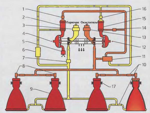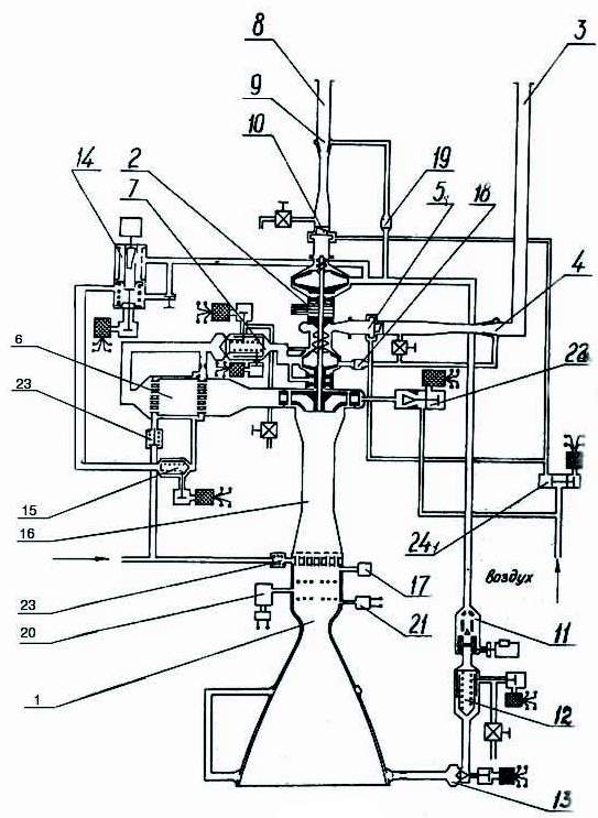 Двигатель состоит из камеры сгорания 1, ТНА 2, системы окислителя, системы горючего, системы газогенерации, агрегатов системы управления, регулирования и контроля режима двигателя. Система окислителя включает в себя магистраль 3 подвода окислителя к преднасосу "О" 4 , клапан пуска 5 окислителя, насос окислителя, магистраль подвода окислителя в газогенератор 6 с клапаном отсечки окислителя 7. Система горючего включает в себя магистраль 8 подвода горючего к преднасосу "Г" 9, клапан пуска 10 горючего, насос, горючего магистрали подвода горючего к камере 1 и газогенератору 6. На магистрали подвода горючего к камере установлены дроссель 11 - исполнительный орган системы СОБ, клапан горючего главной ступени 12, клапан отсечки 13 горючего от камеры. На магистрали подвода горючего к газогенератору установлены регулятор расхода 14 горючего в газогенератор – исполнительный орган системы регулирования тяги двигателя в системе РКС и клапан отсечки 15 горючего от газогенератора. Для слива компонентов топлива из магистралей двигателя после клапанов пуска, в случае несостоявшегося старта, служат ручные вентили на клапанах 7 и 12. Система газогенерации обеспечивает выработку окислительного газогенераторного газа - рабочего тела турбины турбонасосного агрегата. По выходе из турбины газ подается в камеру, где используется в качестве окислителя. Горючее на газогенератор 6 отбирается от насоса "Г", проходит регулятор расхода "Г" 14 - исполнительный орган системы регулирования тяги двигателя в системе РКС, клапан отсечки (15) горючего газогенератора, поступает в рубашку охлаждения газогенератора 6 и, через форсунки впрыскивается в камеру сгорания ГГ. Окислитель в газогенератор подается непосредственно от насоса "О" по магистрали, на которой установлен клапан отсечки 7 окислителя. Окислительный газ, вырабатываемый в газогенераторе, подается на турбину и, после нее, по газоводу 16 вводится в камеру сгорания камеры двигателя, где дожигается. К агрегатам системы управления, регулирования и контроля режима двигателя относятся: регулятор 14 расхода "Г" в газогенераторе - исполнительный орган системы регулирования двигателя по тяге в системе РКС, датчик обратной связи 17, дроссель 11 исполнительный орган системы регулирования двигателя по соотношению компонентов в системе СОБ, клапан пуска окислителя 5, клапан пуска горючего 10, клапан эжектора (преднасоса) окислителя 18, клапан эжектора (преднасоса) горючего 19, сигнализаторы давления 20 и 21, клапан отсечки окислителя 7, клапан отсечки горючего от газогенератора 15, клапан отсечки горючего от камеры 13, клапан горючего главной ступени 12, клапан отсечки запуска 22, обратные клапаны продувки 23. Регулятор 14, установленный на линии питания горючим газогенератора, обеспечивает двухступенчатый запуск и выход автономного двигателя на заданный режим работы. При работе двигателя регулятор совместно с датчиком обратной связи 17, установленным на камере, обеспечивает устойчивую работу двигателя на заданном режиме, а также изменение режима работы двигателя (тяги) по команде от системы РКС ракеты. Дроссель 11 является исполнительным органом системы синхронного опорожнения баков (СОБ). Сигнализатор 20 установлен только на камере двигателя 8Д44 и предназначен для выключения РД в случае преждевременного падания давления в камере. 