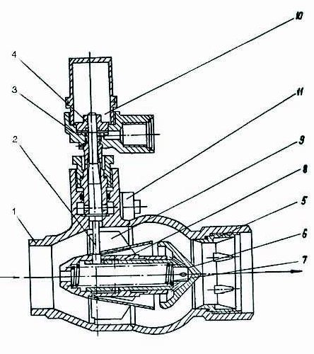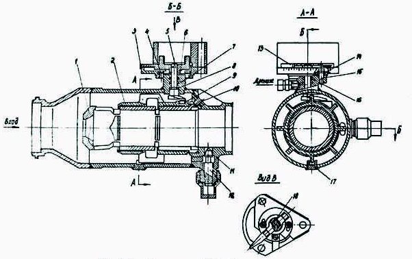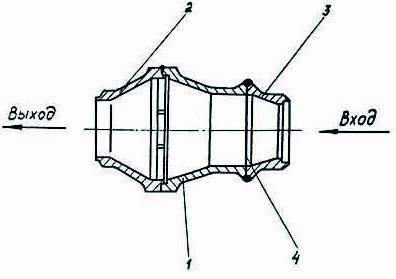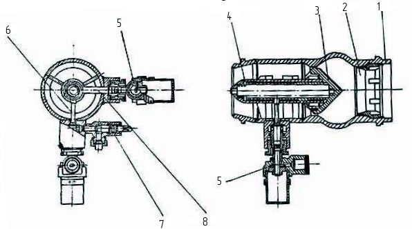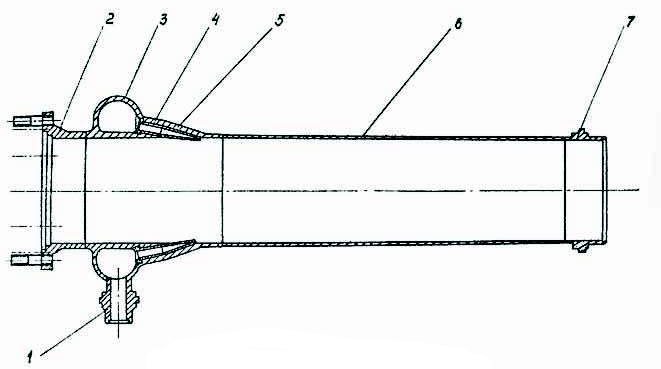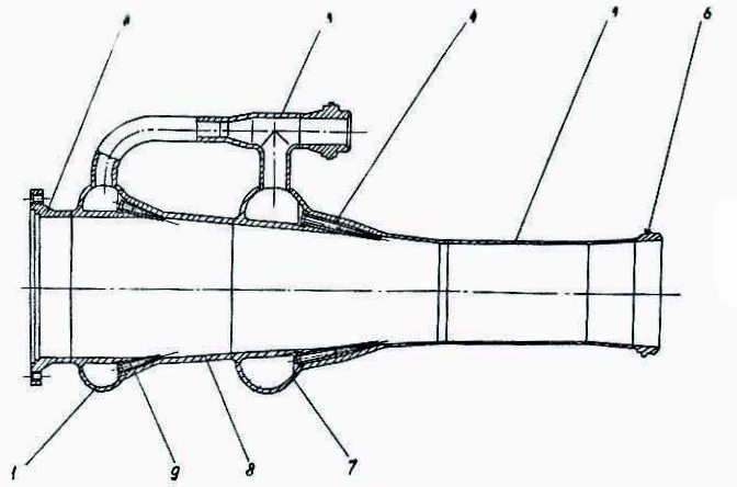 Эжектор горючего выполнен с двенадцатью насадками 4, расположенными по периферии проточной части. Он состоит из корпуса 5, смесительной камеры 6, фланцев 2 и 7. На корпусе расположен коллектор 3 с натрубком 1, через который происходит подвод рабочей жидкости к насадкам. Эжектор выполняется сварным. Материалы: сталь ЭП288, сталь Х18Н10Т. Коллектор выполнен штампованным из листового материала сталь Х17Н5МЗ. Эжектор - преднасос окислителя предназначен для повышения антикавитационных качеств насоса окислителя, что обеспечивает работу двигателя при низком давлении в баке окислителя.