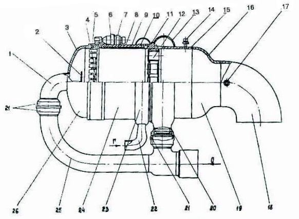 Газогенератор представляет собой неразъемную сварную конструкцию, состоящую из камеры газогенератора 24, головки 26, смесителя 19, трубы подвода 25 и переходника 18. Камера состоит из двух оболочек: наружной 8 и внутренней 9, связанных между собой гофрированной проставкой 6. Проставка припаяна к оболочкам припоем Г70НХ. Камера охлаждается горючим, поступающим через натрубок 22 и коллектор 23 в межрубашечное пространство, а затем в головку. Головка газогенератора представляет собой паяно-сварной узел, состоящий из блоке форсунок 4, днища 3, переходника 1 и отражателя 2. Головка газогенератора имеет 91 основных м 30 периферийных форсунок. Основные форсунки - двухкомпонентные, центробежные, тангенциального типа с наружным смешением компонентов. Периферийные форсунки - однокомпонентные (окислительные) - служат для организации пристеночного слоя с относительно низкой температурой. Газовые втулки 13 служат для перепуска газа из камеры газогенератора в смеситель. Суммарная площадь проходного сечения газовых втулок определена из условия протекания газа через балластировочную решётку со скоростями не более 100 м/с (исходя из допустимой величины потерь). Балластировка осуществляется 36-ю цетробежными форсунками закрепленными пайкой на переднем днище узла с направлением впрыска против газового потока, а также струйными форсунками, выполненными в газовых втулках с направлением впрыска перпендикулярно газовому потоку. Газогенератор запускается с опережением поступления в камеру окислителя по отношению к горючему на 0.09-0.10 с. После стабилизации процесса - температура в камере 1600-1900 К, температура в пристеночном слое 750-850 К. Неравномерность температурного поля генераторного газа, поступающего с выхода ГГ на турбину, ±35°С от номинального (600К) значения.