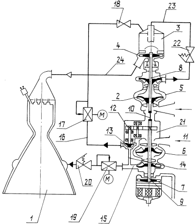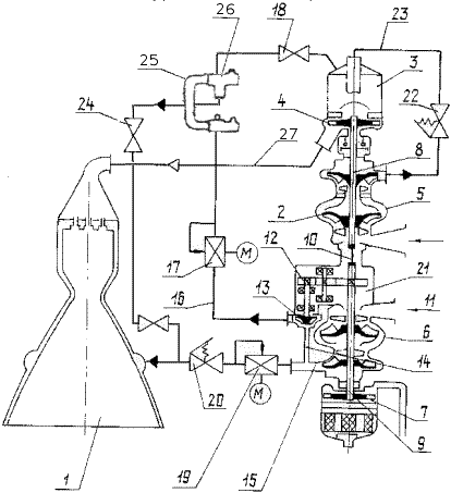 Двигатель содержит камеру сгорания 1, подключенную, соответственно, по линиям питания горючим и окислительным газом к турбонасосному агрегату 2 и к газогенератору 3. ТНА выполнен однороторным. Конструктивно ТНА состоит из двух основных составных частей: турбины 4 с насосом окислителя 5 и основного насоса горючего 6 с пусковой пиротурбиной 7. Каждая часть содержит свой вал, а именно вал насоса окислителя 8 и вал основного насоса горючего 9, соединенные рессорой 10. Со стороны подвода горючего 11 к валу 9 основного насоса горючего через шестеренчатый мультипликатор 12 механически подключен дополнительный (дожимной) насос горючего 13. Гидравлически же вход 14 дополнительного насоса подключен к выходу 15 основного насоса горючего, а выход его через линию питания горючим 16, регулятор тяги 17 и отсечной клапан 18 подключен к двухкомпонентному газогенератору 3. Выход 15 подключен через регулятор соотношения компонентов 19 и клапан 20 с трактом охлаждения камеры сгорания 1. Внутренняя полость корпуса 21 мультипликатора с размещенными в ней шестеренками гидравлически подключена ко входу основного насоса горючего 6. Выход насоса окислителя через клапан 22 подключен к газогенератору 3 по линии 23, а выхлод из газогенератора - к головке камеры сгорания 1 по линии 27. В процессе работы ЖРД и при его запуске весь расход окислителя подается из насоса по линии 23 на окислительный газогенератор 3. Одновременно горючее подается с выхода 15 из основного насоса горючего 6 на камеру сгорания 1 и на вход 14 дополнительного насоса 13. Получив в нем дополнительный напор на больших оборотах с большим кпд, горючее по линии 16 попадает на сгорание в газогенератор 3. В двигателе использованы прямоточные дифференциальные клапаны управления, автоматически срабатывающие при заданном перепадне давлений компонентов топлива.