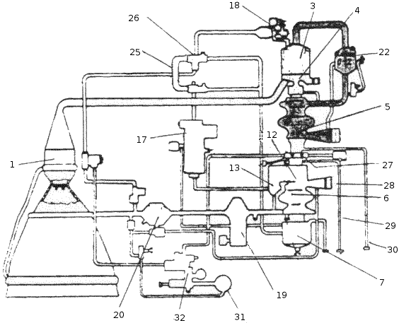 Выключение двигателя производится путем прекращения подачи горючего в газогенератор при закрытии клапана 18,