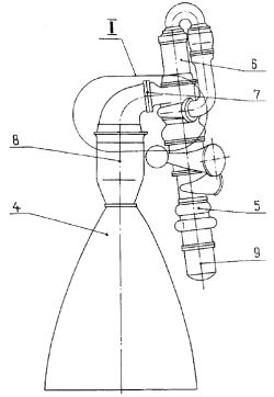 Высокие удельная тяга и запасы устойчивости горения при простом конструктивном исполнении в значительной степени обеспечены конфигурацией тракта генераторного газа. Газовый тракт объединяет три основные сборочные единицы двигателя: камеру сгорания 4, турбонасосный агрегат 5 и газогенератор 6. Камера сгорания скреплена с ТНА по плоскости стыковки 7, причем ТНА с соосным ему газогенератором расположен сбоку от камеры сгорания. При этом ось камеры 8 и ось ТНА 9 образуют небольшой острый угол. ТНА снабжено консольной осевой газовой турбиной 10 с ее валом 11, которая помещена в полом корпусе 12 турбины с его внутренней лобовой поверхностью 13, выхлопным патрубком 14 и плоскостью стыковки 15 с корпусом газогенератора 16. Полый корпус газогенератора с полым корпусом турбины и выхлопным патрубком образуют Г-образное колено для протока генераторного газа с возможностью приведения колеса турбины 10 во вращение. Углы в колене, а именно в корпусе 12, плавно скруглены, а плоскость вращения колеса турбины установлена под прямым углом к плоскости стыковки 7 выхлопного патрубка 14 турбины и входного патрубка 15 газовода 17 камеры сгорания. Газовод 17 выполнен кривоосным, диффузорным и состоит из последовательно скрепленных входного патрубка 15 и конического переходника 18. Внутри патрубка 15 установлена вогнутая по направлению потока выравнивающая решетка 19, которая ограничивает предфорсуночную полость 20. Угол изгиба газовода составляет менее 90°, причем осевые линии газовода 17, патрубка 14, турбины 10 и газогенератора 6 лежат в одной плоскости. Входной патрубок в плоскости стыковки 7 с ТНА выполнен с круглым проходным сечением 21, и плоскость вращения колеса турбины расположена в таком продольном положении относительно газовода 17, что она проходит через верхнюю половину плоскости стыковки 7. Практически это условие определяет осевое положение ТНА в пространстве около камеры сгорания. В целом, Г-образное колено, образованное корпусом газогенератора 16 и выхлопным патрубком 14 турбины и сопряженное с кривоосным газоводом 17, образует расположенный в одной плоскости тракт генераторного газа с выходом его на форсуночную головку 23. Газовод 17 выполнен длиной по осевой линии, равной не менее 1.3 наибольшего диаметра переходника 18, и степенью расширения газовода не более 4.6. Выравнивающая решетка 19 выполнена из листового материала, причем периферийная ее часть выполнена конической с соблюдением перпендикулярности стенки к стенке входного патрубка 15, а донная ее часть - сферической. Решетка установлена по осевой линии входного патрубка на удалении от плоскости стыковки 7, равном не менее 0.8 от длины газовода, а от входа в газовые форсунки на расстоянии по оси камеры сгорания, равном, как минимум, шести диаметрам центральных отверстий в решетке. Решетка 19 выполнена с увеличенными коэффициентами живого сечения на участке, прилегающем к минимальному радиусу канала входного патрубка, и на периферийных участках по сравнению с коэффициентом живого сечения на центральных участках. Основные газовые форсунки 30 форсуночной головки 23 изготовлены с относительной длиной газовых каналов форсунок не менее 6, а сама форсуночная головка выполнена с коэффициентом живого сечения, равным 0.18-0.2. Двигатель работает следующим образом. Генераторный газ, выработанный в генерат