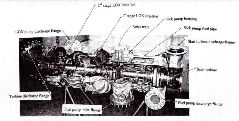 В модернизированном двигателе выход дополнительного насоса подключен через линию питания горючим 16, регулятор тяги 17, отсечной клапан 18, заполненную пусковым горючим ампулу 25 и два пусковых клапана 26 подключен к двухкомпонентному газогенератору 3. Кроме того, выход верхнего (по схеме) клапана 26 через пусковой клапан 24 и обратный клапан подключен к коллектору горючего камеры сгорания.